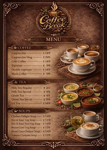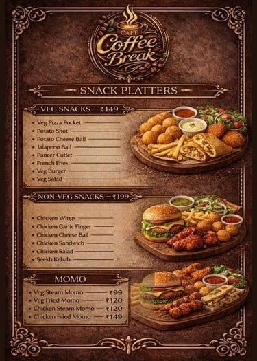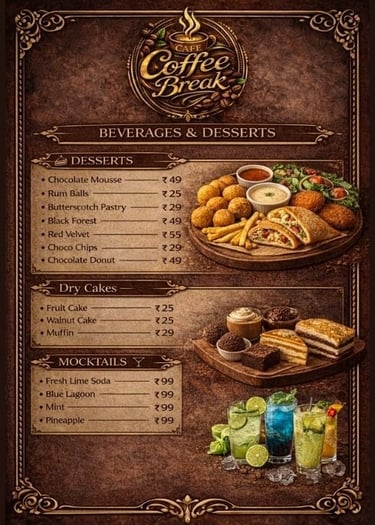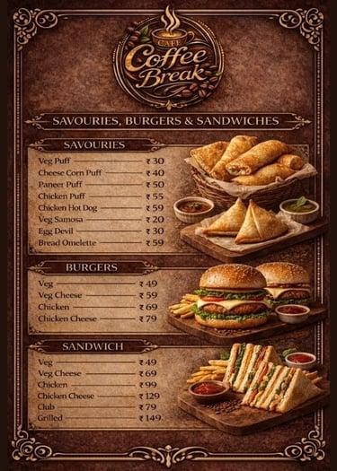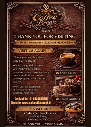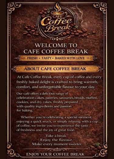 At Cafe Coffee Break, every bite tells a story — from warm breads to rich celebration cakes, crafted with love and finest ingredients.